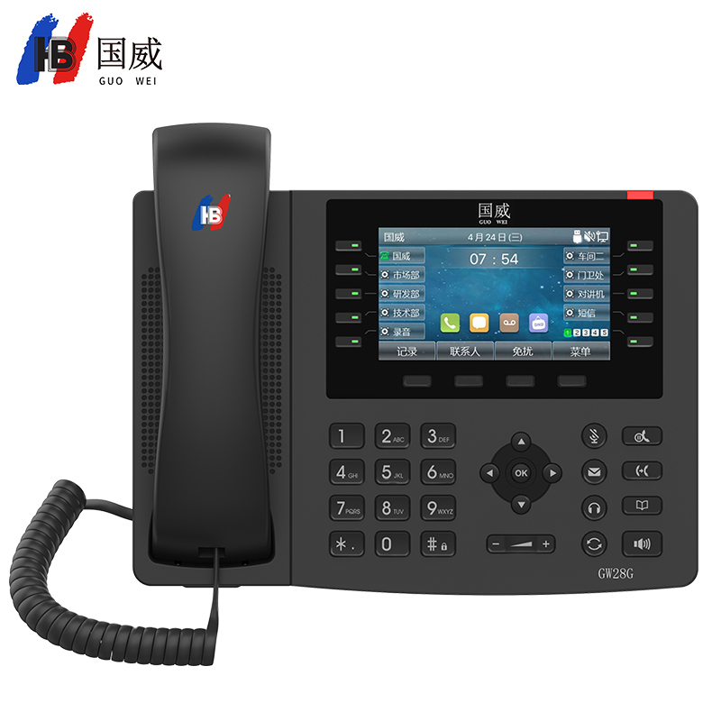 国威GW28G是一款20线路、4.3英寸(480*272)高清背光液晶彩屏高端商务数字SIP网络电话机,大屏幕、可显示视频通话的对端视频,保障个人隐私。
